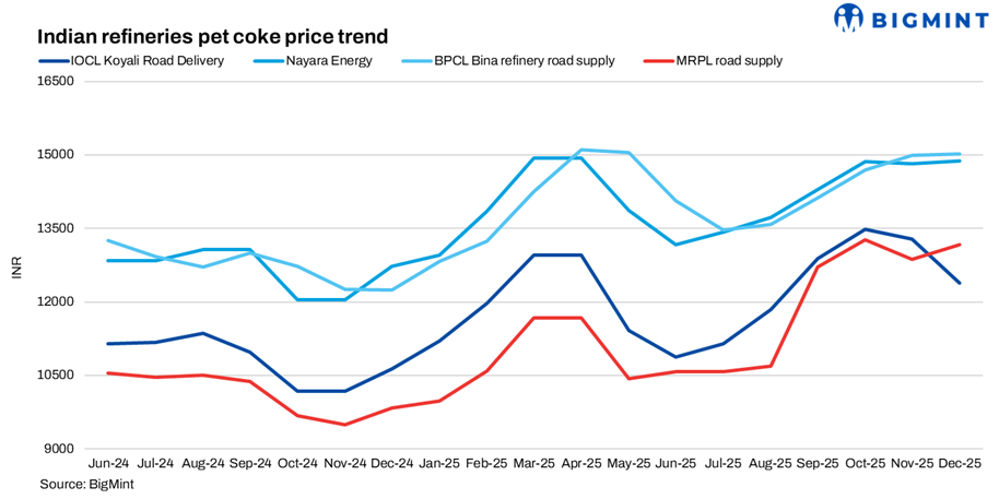 Indian refiners varied their pet coke offers significantly for the month of December, reflecting refinery-specific supply conditions and regional demand patterns. IOCL implemented steep reductions of INR 480-900/t across its refineries, marking the sharpest cuts in recent months. In contrast, Nayara, CPCL, MRPL, and BPCL raised prices slightly-by 0.2-4%, on the back of strong regional demand. The split highlights tightening fundamentals for some refiners while IOCL adjusts aggressively to market dynamics.
