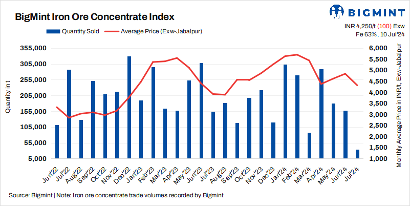 BigMint’s weekly iron ore concentrate index stood at INR 4,250/t ($51/t) exw, showing a fall of INR 100/t ($1/t) as against the last assessment on 6 July. Prices are hovering at over two-month low. However, buyers’ bids were heard at lower levels of INR 3,900/t ($47/t) exw. Although, deals at such lower price levels are still awaited.