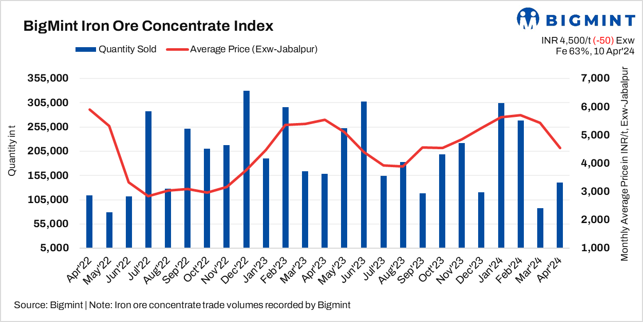 BigMint’s bi-weekly index for Fe 63% concentrate currently stands at INR 4,500/t ($54/t) exw, a marginal drop of INR 50/t ($1/t) as against the last assessment on 6 April.