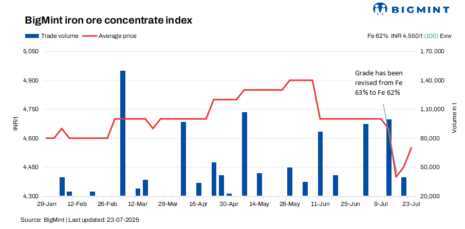 BigMint’s bi-weekly index for Fe 62% concentrates stood at INR 4,550/t exw ($53/t) exw, up by INR 100/t ($1/t) as against the last assessment on 19 July. Meanwhile, Fe 63% iron ore concentrate prices are hovering in the range of INR 4,600-4,700/t ($53–54/t) exw, reflecting a firm pricing outlook supported by current market fundamentals.