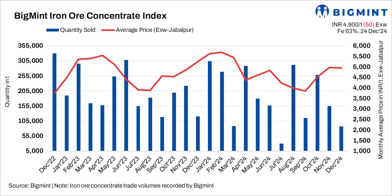 BigMint’s weekly iron ore concentrate index was assessed at around INR 4,900/tonne (t) ($58/t) exw-Jabalpur, a decrease of INR 50/t ($1/t) from the previous assessment on 21 December, 2024. A few offers at higher levels of INR 5,200/t ($61/t) exw were also reported, but buyers rejected them, preventing any trades from being finalized. A buyer told BigMint, “It should be at this level. However, we haven’t been lifting concentrate for the past month.”