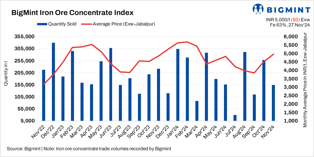BigMint’s weekly iron ore concentrate index was assessed at around INR 5,000/tonne (t) ($59/t) exw-Jabalpur, a decrease of INR 50/t ($1/t) from the previous assessment on 23 November, 2024.