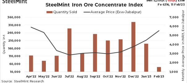 - SteelMint’s price assessment of Fe63% iron ore concentrate stands at INR 5,200/t exw-Jabalpur today, down by INR 150/t as against the last assessment on 8 Feb.