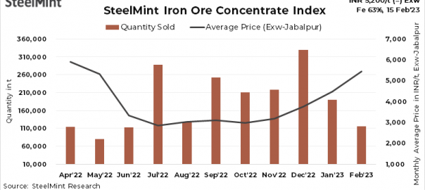 Iron ore concentrate prices in Jabalpur, central India, saw a downtrend w-o-w. SteelMint’s index for Fe 63% concentrate prices currently stands at around INR 5,200/tonne (t) exw, down INR up to 150/t, w-o-w. The drop in pellet prices and an inactive buying at higher offers has pulled down offers for iron ore concentrate.