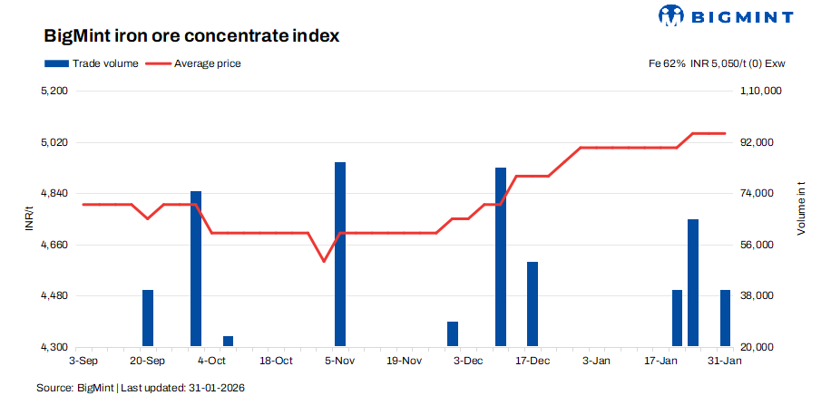 • Indian Fe 62% iron ore concentrate prices remained steady at INR 5,050/t ($55/t) exw-Jabalpur on 31 Jan’26 against 28 Jan’26, as per BigMint’s latest assessment.