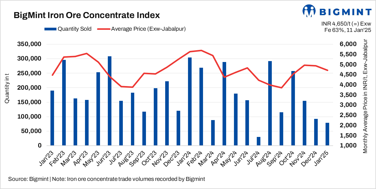 • BigMint assessed Fe 63% iron ore concentrates at INR 4,650/t ($54/t) exw-Jabalpur, stable as against the last assessment on 8 Jan’25.
