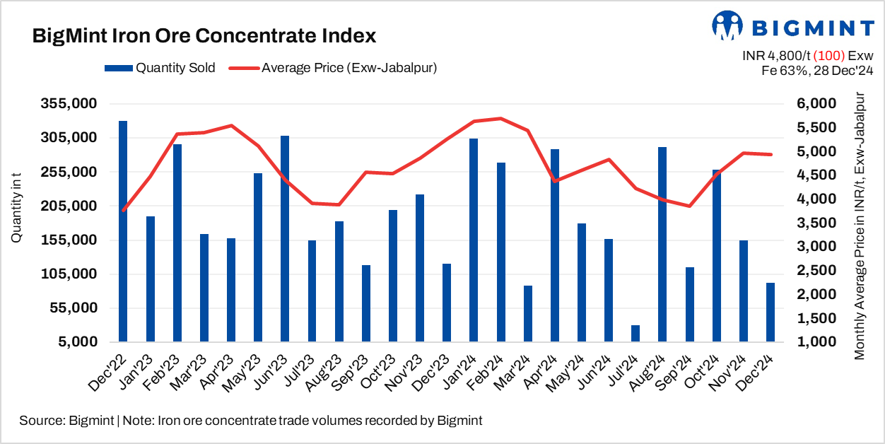 • BigMint’s assessment for Fe 63% iron ore concentrate stood at INR 4,800/t ($56/t) exw-Jabalpur, marking a fall of INR 100/t ($1/t) w-o-w.