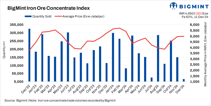 - BigMint’s assessment for Fe63% iron ore concentrates stood at INR 4,950/t ($58/t) exw-Jabalpur, marking a fall of INR 50/t ($1/t) w-o-w.
