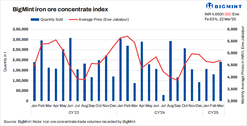 • BigMint’s assessment for Fe 63% iron ore concentrate stood at INR 4,650/t ($54/t) exw-Jabalpur, reflecting a fall of INR 50/t ($1/t) w-o-w.