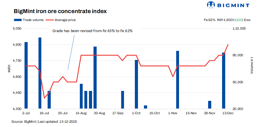 - BigMint’s latest assessment for Fe 62% iron ore concentrate placed prices at INR 4,900/t ($54/t) exw-Jabalpur on 13 Dec, higher by INR 100/t ($1/t) from 10 Dec’25.