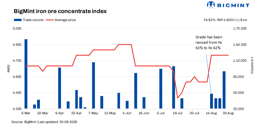 - BigMint’s assessment for Fe 62% iron ore concentrates stood at INR 4,800/t ($54/t) exw-Jabalpur, steady as compared to the last assessment on 27 Aug’25.