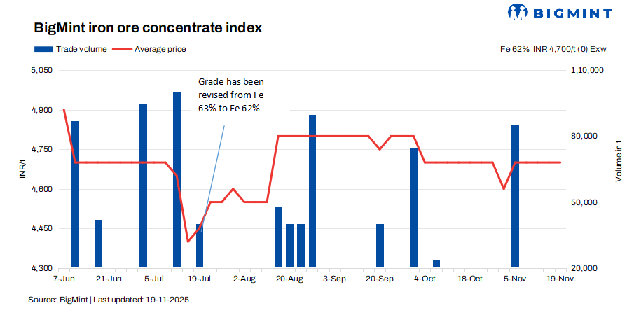 BigMint’s bi-weekly assessment for India’s iron ore concentrates (Fe 62%) remained steady at INR 4,700/tonne ($53/t) ex-works Jabalpur on 19 November, in line with the previous evaluation on 15 November. Market participants highlighted that prices continued to exhibit resilience, buoyed by steady buying interest. In fact, a few trades were heard at slightly higher levels, signalling the underlying strength in this grade.