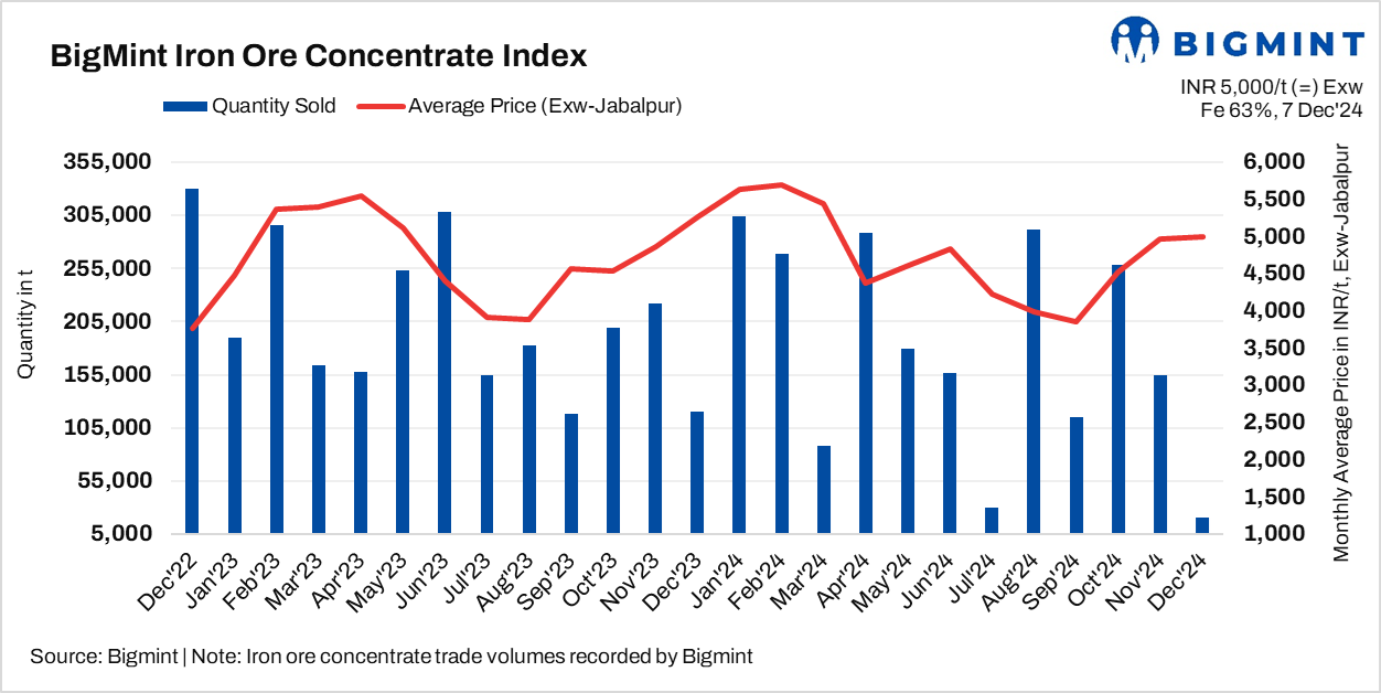 • BigMint’s assessment for Fe 63% iron ore concentrates stood at INR 5,000/t ($59/t) exw-Jabalpur, stable as against the last assessment on 4 Dec’24.