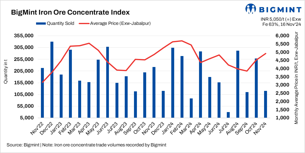 - BigMint’s assessment for Fe 63% iron ore concentrates stood at INR 5,050/t ($60/t) exw-Jabalpur, stable as against the last assessment on 13 Nov’24.