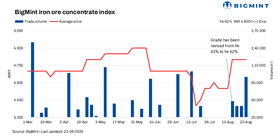 - BigMint’s assessment for Fe 62% iron ore concentrates stood at INR 4,800/t ($55/t) exw-Jabalpur, remained steady as compared to the last assessment on 20 Aug’25.