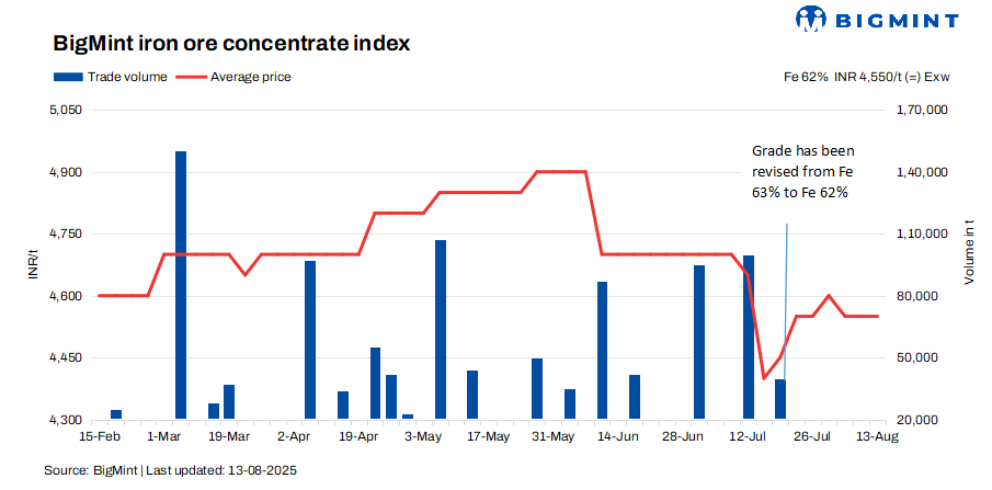 BigMint’s bi-weekly iron ore concentrate index stood stable at INR 4,550/tonne (t) ($52/t) exw-Jabalpur, stable in comparison with the previous assessment on 6 August 2025. Meanwhile, Fe 63% iron ore concentrate prices are hovering in the range of INR 4,700-4,900/t ($54-56/t) exw.