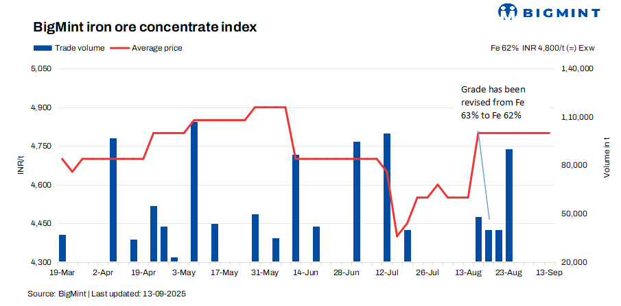 - BigMint’s assessment for Fe 62% iron ore concentrates stood at INR 4,800/t ($54/t) exw-Jabalpur, steady as compared to the last assessment on 10 Sep’25.