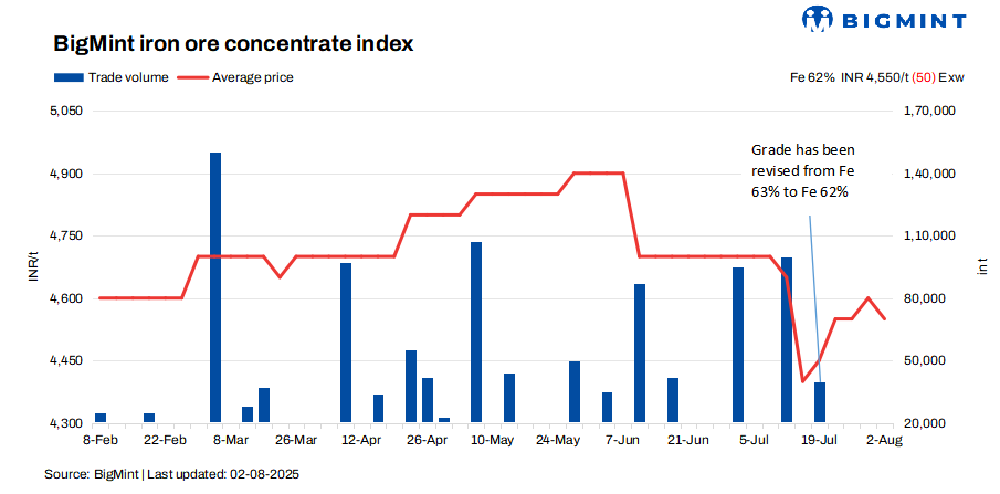 - BigMint’s assessment for Fe 62% iron ore concentrates stood at INR 4,550/t ($52/t) exw-Jabalpur, inching down by INR 50/t ($1/t) as compared to the last assessment on 30 Jul’25.