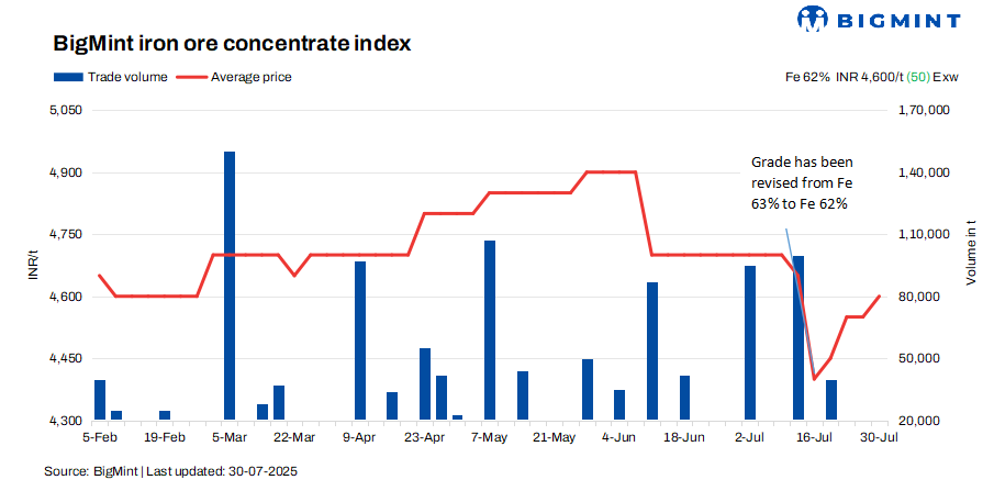 BigMint’s bi-weekly index for Fe 62% concentrates stood at INR 4,600/t exw ($54/t) exw, edged up by INR 50/t ($1/t) as against the last assessment on 26 July. Meanwhile, Fe 63% iron ore concentrate prices are hovering in the range of INR 4,700/t ($54/t) exw.