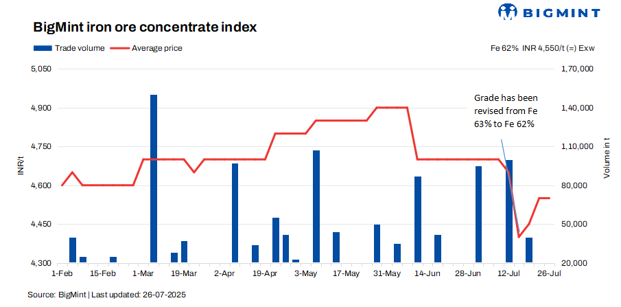 • BigMint’s assessment for Fe 62% iron ore concentrates stood at INR 4,550/t ($53/t) exw-Jabalpur, firm as compared to the last assessment on 23 Jul’25.
