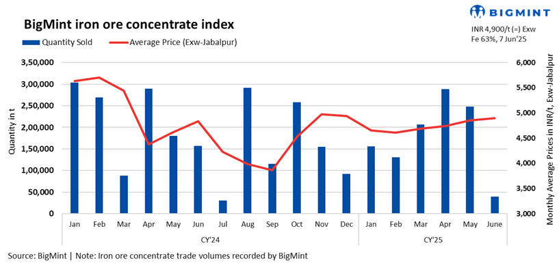 - India’s Fe 63% iron ore concentrate prices were stable at INR 4,900/t ($57/t) exw-Jabalpur, against the last assessment on 4 Jun’25. A deal of 5,000 t was recorded.