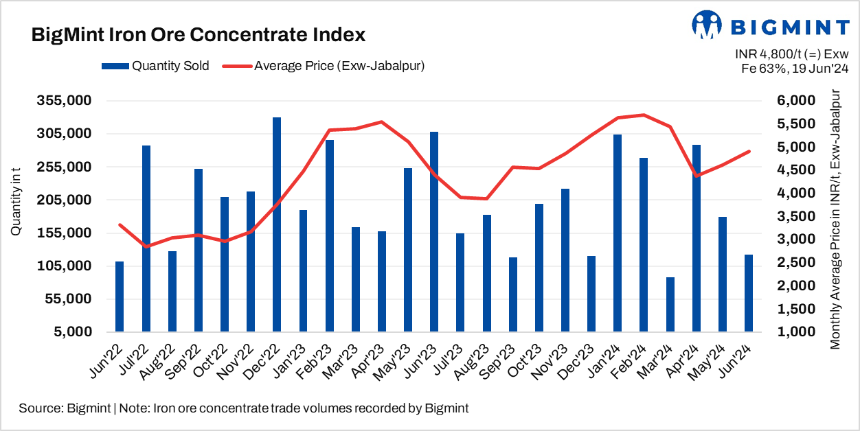 BigMint’s weekly iron ore concentrate index stood at around INR 4,800/t ($57/t) exw, unchanged as against the last assessment on 15 June.