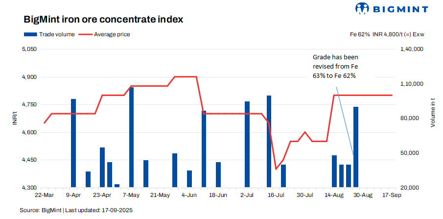 BigMint’s bi-weekly India iron ore concentrate index stood at INR 4,800/tonne (t) ($54/t) exw-Jabalpur, flat from the previous assessment on 13 September 2025. Prices of Fe 63% iron ore concentrates hovered near INR 4,900-5,100/t ($56-58/t) exw.