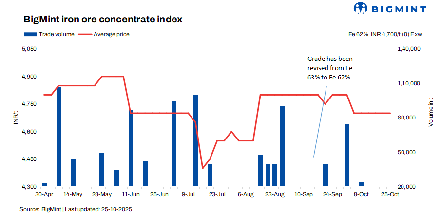 - BigMint’s assessment for Fe 62% iron ore concentrates stood at INR 4,700/t ($53/t) exw-Jabalpur, firm as compared to the last assessment on 18 Oct’25.