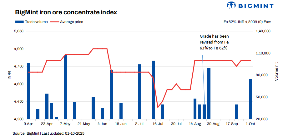 BigMint’s bi-weekly assessment for India iron ore concentrate stood unchanged at INR 4,800/tonne ($54/t) exw-Jabalpur, holding firm from the previous evaluation on 27 September 2025. Meanwhile, Fe 63% concentrate prices hovered near INR 5,000/tonne ($56/t) exw, though the absence of any concluded trades at these levels reflected the market’s hesitancy and lack of conviction.