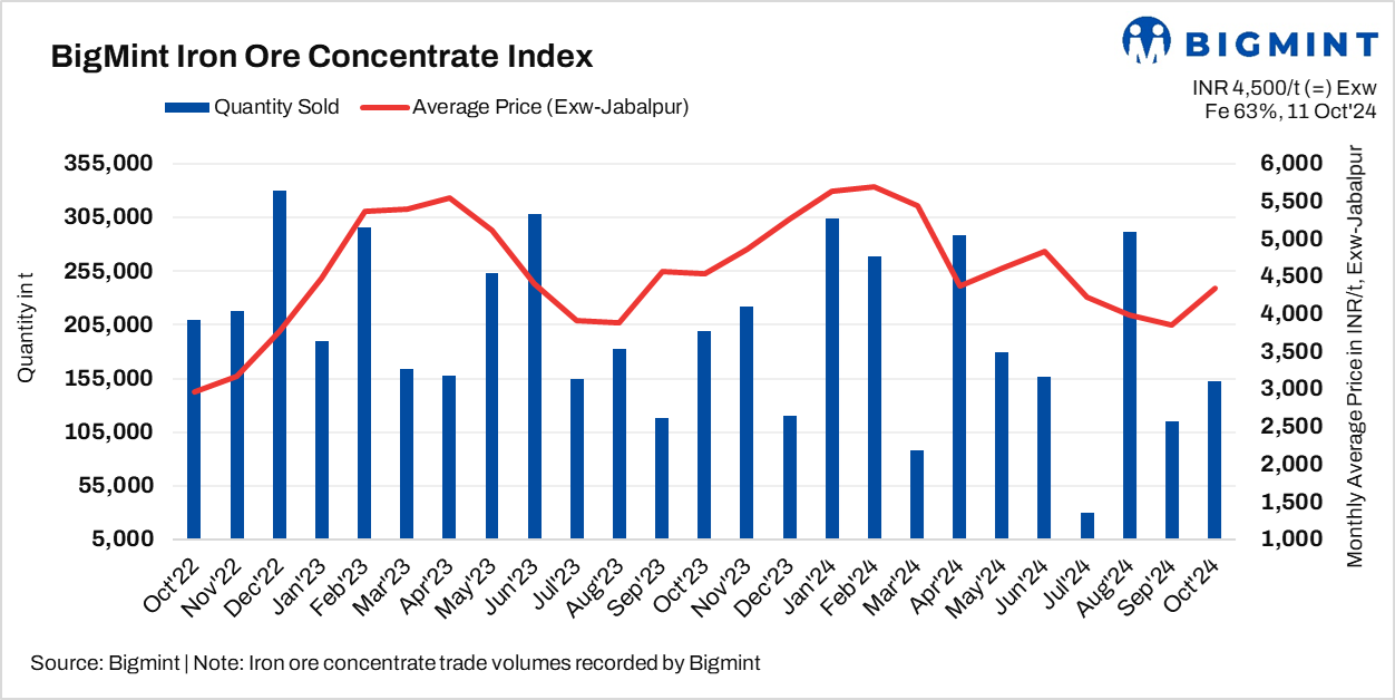 - BigMint’s assessment for Fe 63% iron ore concentrates stood at INR 4,500/t ($54/t) exw-Jabalpur. However, some offers were also heard at INR 4,600/t exw ($55/t).
