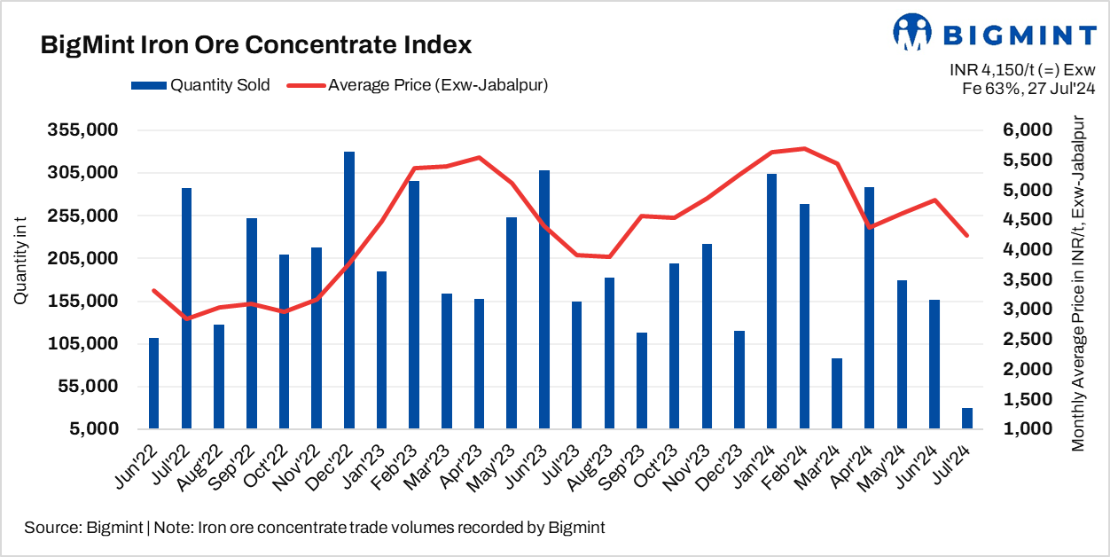- BigMint’s price assessment for Fe 63% iron ore concentrate stands at INR 4,100-4,200/t ($49-50/t) exw Jabalpur, unchanged as against the last assessment on 24 Jul’24.