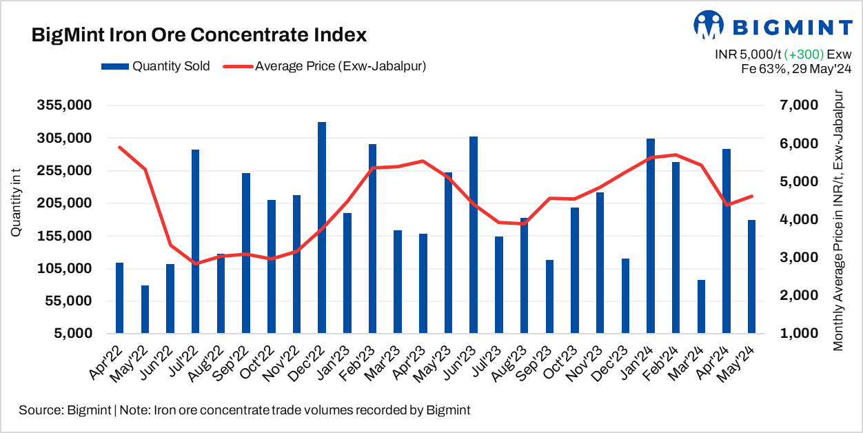 BigMint’s weekly iron ore concentrate index stood at INR 5,000/t ($60/t) exw, up by INR 300/t ($4/t) as against the last assessment on 25 May. The index has risen to a two-month high as similar levels were last seen in end-March, 2024, as per data maintained with BigMint. Some offers were also heard at a higher level of INR 5,300/t ($64/t) exw, although no deals were reported.