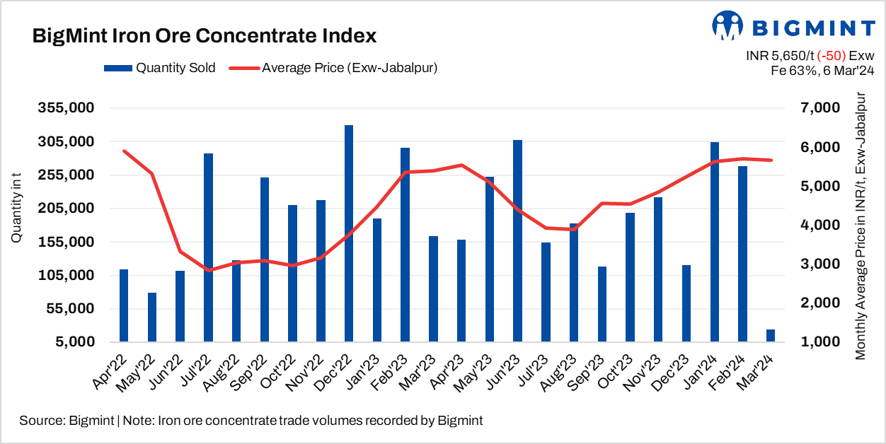 • Odisha iron ore prices fall w-o-w: BigMint’s weekly Odisha iron ore fines (Fe 62%) index decreased by INR 200/t ($2/t) w-o-w to INR 5,250/t ($63) ex-mines on 2 March, 2024. Iron ore prices in Odisha remained under pressure following the decrease in pellet offers amid soft demand. Meanwhile, subdued demand in the export market weighed on domestic iron ore prices as well. Miners offered lower-grade material with slightly lower offers in order to liquidate stocks.