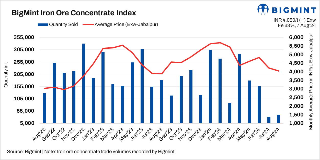 BigMint’s weekly iron ore concentrate index stood at INR 4,000-4,100/t ($48-49/t) exw, stable against the last assessment on 3 August. However, buyers’ bids were heard at lower levels of INR 3,900/t ($46/t) exw. However, deals at such lower price levels are still awaited.