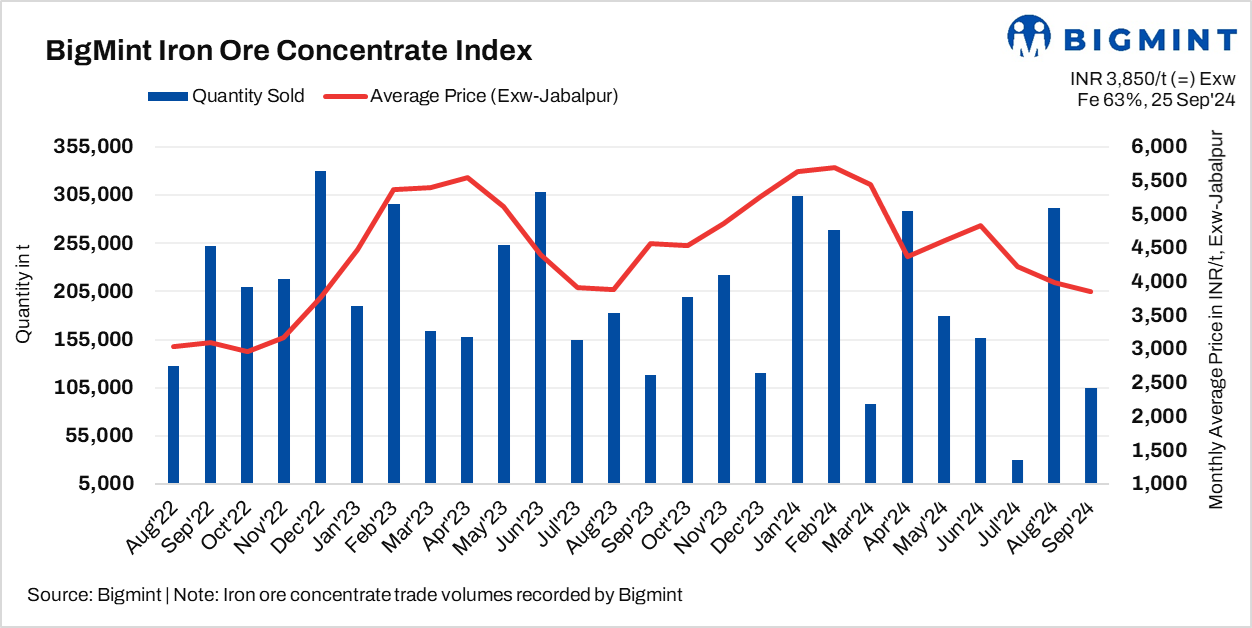 BigMint’s weekly iron ore concentrate index was assessed at around INR 3,850/t ($46/t) exw-Jabalpur, unchanged from the previous assessment on 21 September, 2024.