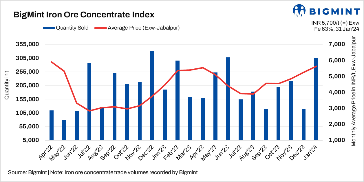 BigMint’s bi-weekly index for Fe 63% concentrate currently stood at INR 5,700/t ($69/t) exw, stable, w-o-w.