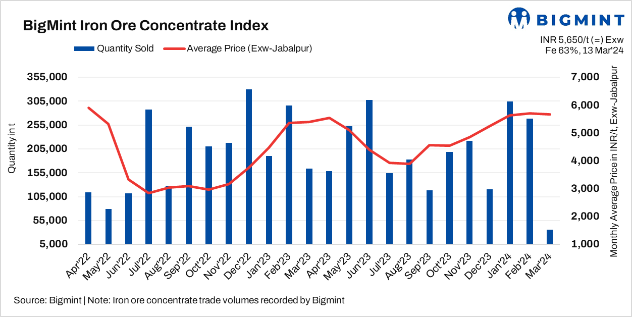 BigMint’s bi-weekly index for Fe 63% concentrate currently stands at INR 5,650/t exw ($68/t) exw, stable as against the last assessment on 9 March.