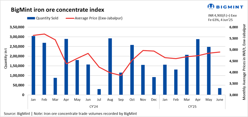 Iron ore concentrate (Fe 63%) prices in Jabalpur, India, remained stable in recently concluded deals compared to the previous assessment on 31 May 2025, with BigMint’s bi-weekly index for the same assessed at INR 4,900/tonne (t) ($57/t) exw Jabalpur.