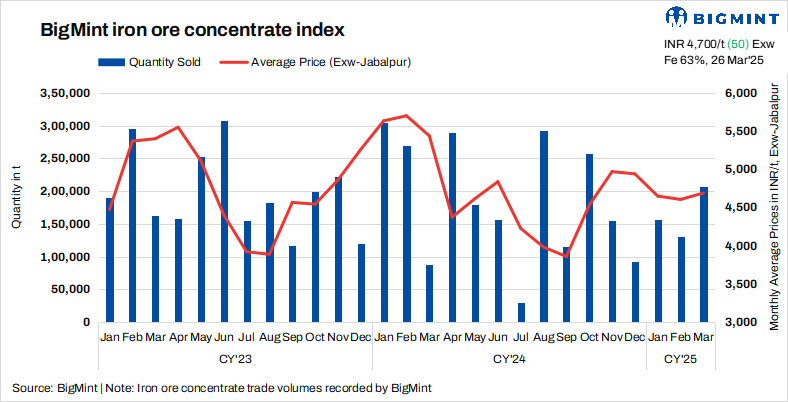 Iron ore concentrate prices in Jabalpur, India, remained supported this week, with BigMint’s bi-weekly index assessed at INR 4,700/tonne (t) ($55/t) exw-Jabalpur, an increase of INR 50/t ($1/t) from the previous assessment on 22 March 2025.
