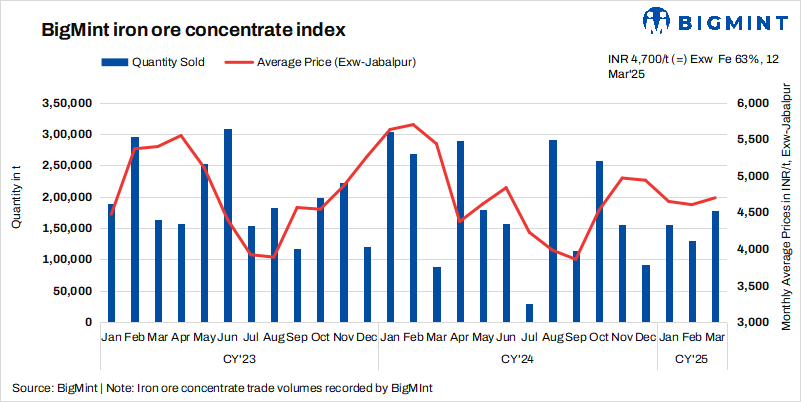 BigMint’s weekly iron ore concentrate index was assessed at around INR 4,700/tonne (t) ($54/t) exw-Jabalpur, stable against the previous assessment on 8 March 2025.