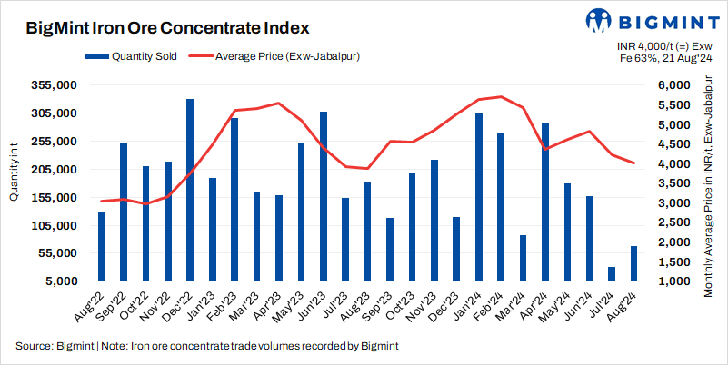 - Bids drop in OMC’s recent iron ore fines auction: In OMC’s auction for 1.515 million tonnes (mnt) of iron ore fines (Fe 54-65%) on 20 August, 2024, the entire quantity was booked at INR 2,020-4,500/t. Bids (weighted average) for fines lots decreased by around INR 500/t compared to last month. The auction saw a sluggish response due to declining pellet and sponge iron prices, as well as a drop in global prices.