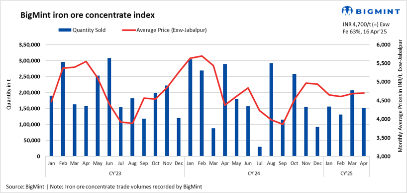 BigMint’s weekly iron ore concentrate index was assessed at INR 4,700/t($55/t) exw-Jabalpur, stable against the previous assessment on 12 April.