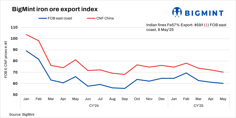 BigMint’s bi-weekly Indian low-grade iron ore fines (Fe 57%) export index inched down by $1/t w-o-w to $59/t FOB east coast, India, on 8 May. The FOB prices dropped amid the hike in the vessel freight. Trade activity in the Indian Ocean remained weak amid lack of inquiries and buying interest, but a few exporters concluded deals.