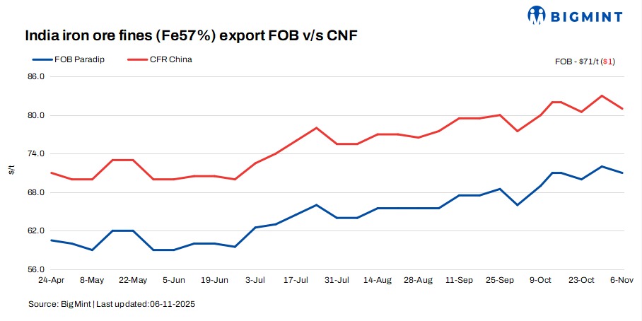 BigMint’s bi-weekly Indian low-grade iron ore fines (Fe 57%) export index fell by $1/tonne (t) w-o-w to $71/t FOB east coast on 6 November. Meanwhile, the index stood stable w-o-w at $81/t CFR China. Around 55,000 t of Fe 57% iron ore fines were heard sold at $71/t FOB Paradip, while a few other deals were heard under negotiation.
