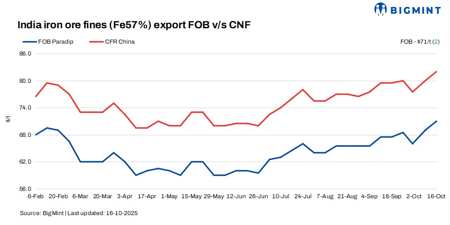 BigMint’s bi-weekly Indian low-grade iron ore fines (Fe 57%) export index rose by $2/tonne (t) w-o-w to $71/t FOB east coast on 16 October. Indian low-grade fines export prices reached an eight-month high, matching levels last seen in the first half of February 2025.