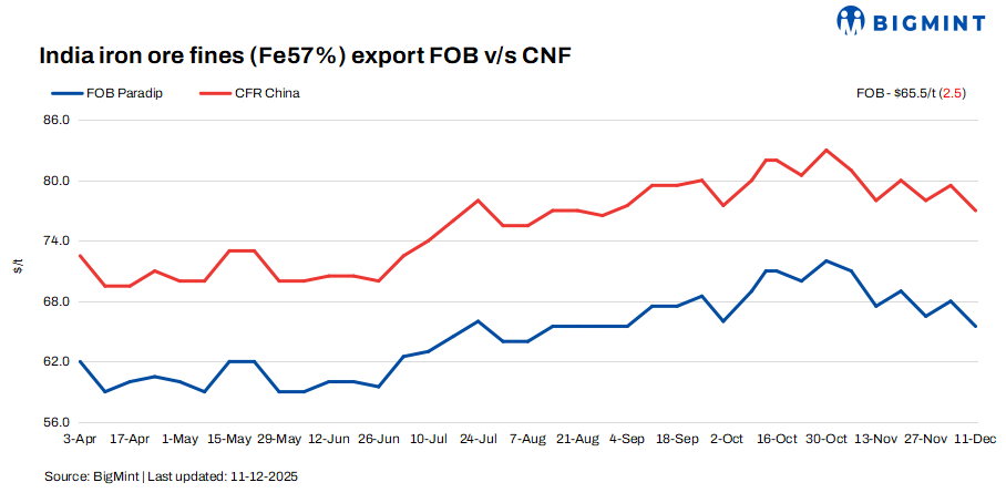 India’s iron ore export market witnessed a notable price correction in the week ended 11 December, with offers slipping by $ 3-4/t amid weak buying interest from Chinese mills and subdued liquidity in the seaborne market. Market participants indicated that a significant number of previously booked cargoes remain unsold in China, creating pressure on traders and adding to the bearish sentiment.