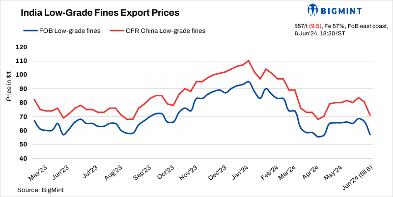 BigMint’s weekly Indian low-grade iron ore fines (Fe 57%) export index fell sharply by $9.5/t w-o-w to $57/tonne (t) FOB east coast on 6 June 2024. No active deals were witnessed this week as exporters remained sidelined in a declining market. Prices have fallen significantly, with an exporter from Odisha selling 55,000 t of Fe57% iron ore fines at $80/t CFR China towards the end of last week. Fe 54% fines export price indications were at around $59-60/t CFR China.