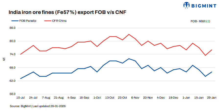 Indian iron ore fines export prices increased w-o-w on 29 January 2026, with a marginal narrowing of discount levels against the global Fe 61% benchmark index. The seaborne market continued to witness cautious sentiment, although sporadic buying interest provided some stability to prices.