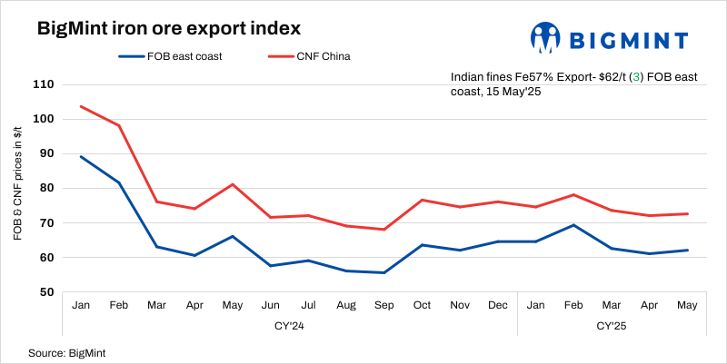BigMint’s bi-weekly Indian low-grade iron ore fines (Fe 57%) export index increased by $3/tonne (t) w-o-w to $62/t FOB east coast, India, on 15 May. Trade activity in the Indian Ocean remained moderate, and inquiries increased with the northward march of prices.