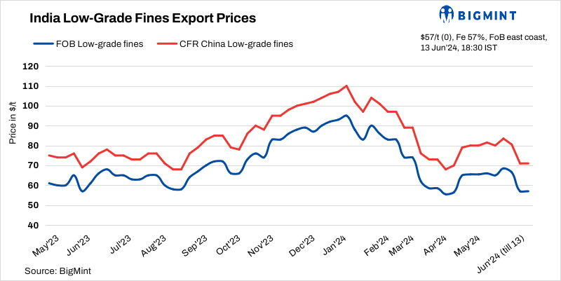 BigMint’s weekly Indian low-grade iron ore fines (Fe 57%) export index remained stable w-o-w at $57/tonne (t) FOB east coast on 13 June 2024. No active deals were witnessed this week as most of the buyers were away from the market during the Dragon Boat festival holidays in China. However, an Odisha-based miner sold a few cargos at $72/t CFR China a couple of days ago but the transactions have yet to be confirmed from the seller’s end. However, Fe 54% fines export price still stand at 35-36% discount to $59-60/t CFR China.